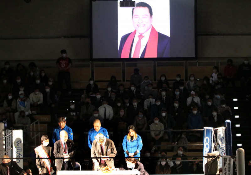 後ろには猪木さんの遺影が。30カウントゴングを叩く初代タイガーマスク佐山聡