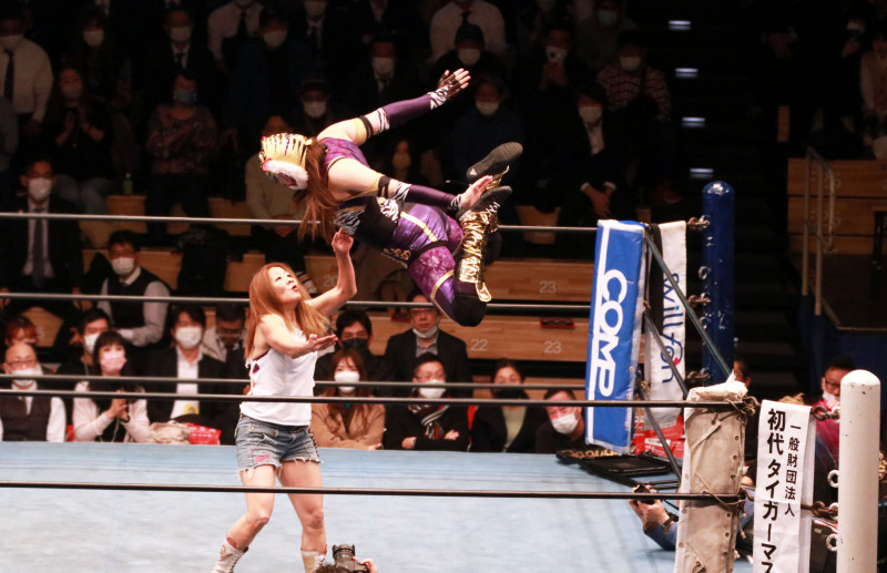 コーナーから華麗にボディアタックを仕掛けるタイガークイーン