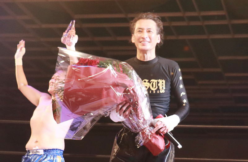 大沢は試合後、一旦リングを降りると宣言、「来年新たな挑戦をします」とも。左は対戦したYogibo木村社長