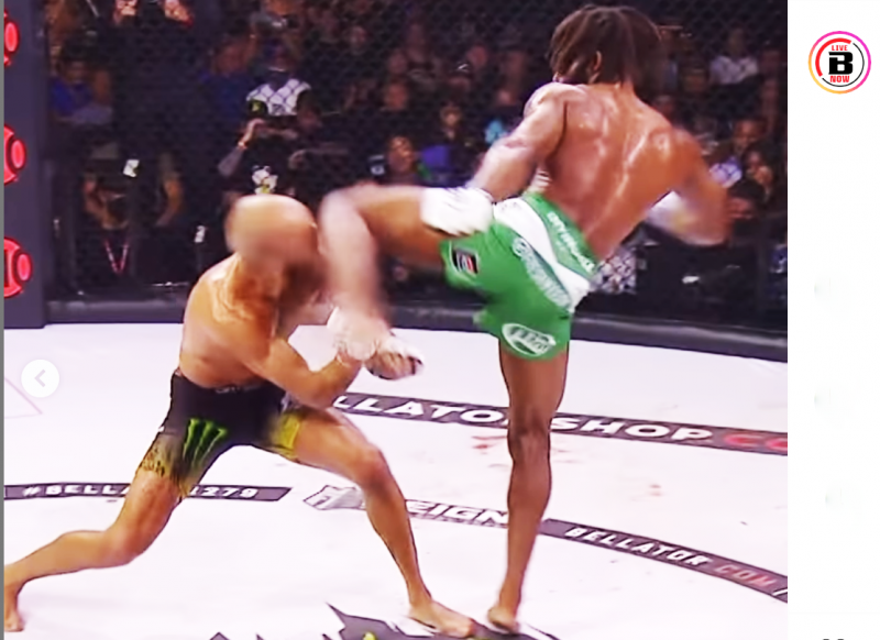スタッツの左ハイキックのヒザがアーチュレッタの顔面を直撃した瞬間@bellatormmaより