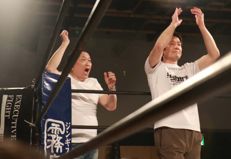 幻冬舎の見城徹社長(左)とキックトレーナーの大野崇が声援を送る