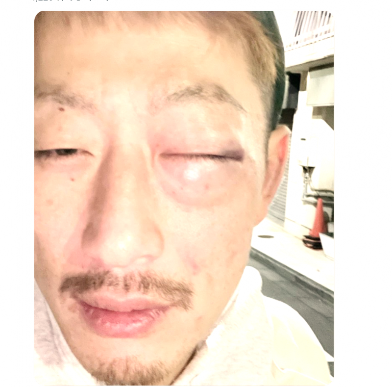 おでんつんつん男は、前回の試合後、自身のTwitterで左目が大きく腫れた写真を公開した(@odentuntun1000)