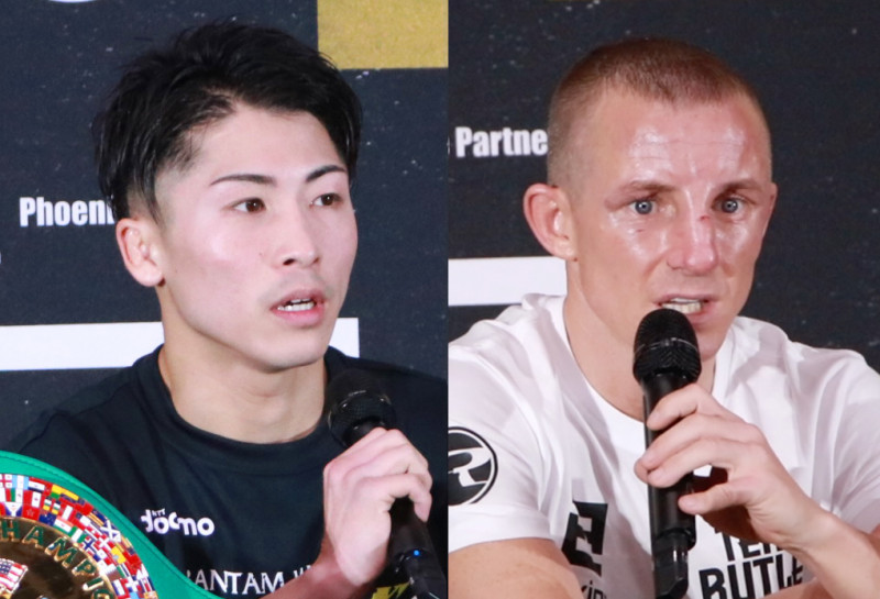 井上は試合後とは思えない無傷な顔、バトラーは鼻に傷、顔も腫らす