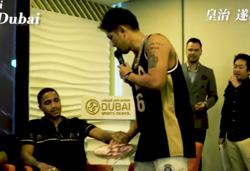 メイウェザーのお面を渡す皇治(皇治Youtubeより)