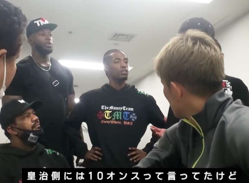9月、メイウェザー軍団がジジに挑む皇治に詰め寄り直前でグローブ変更を要求(RIZIN YouTubeより)