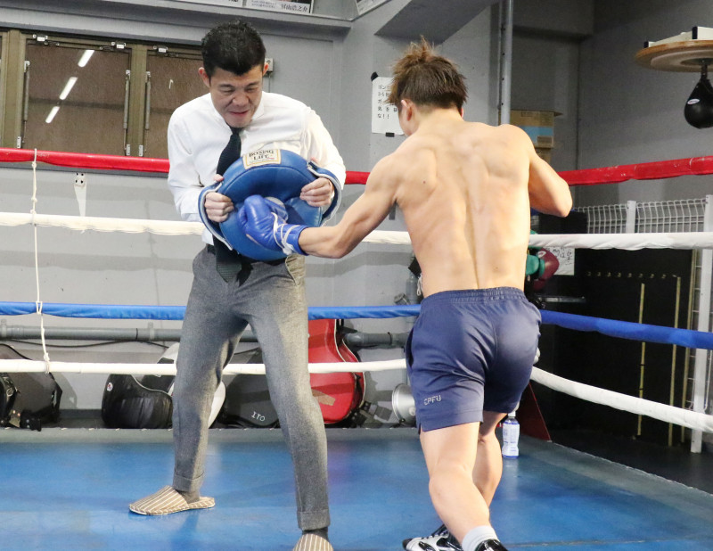 亀田の持つドラムミットに強烈なパンチを打ち込む重岡©︎3150FIGHT
