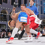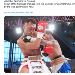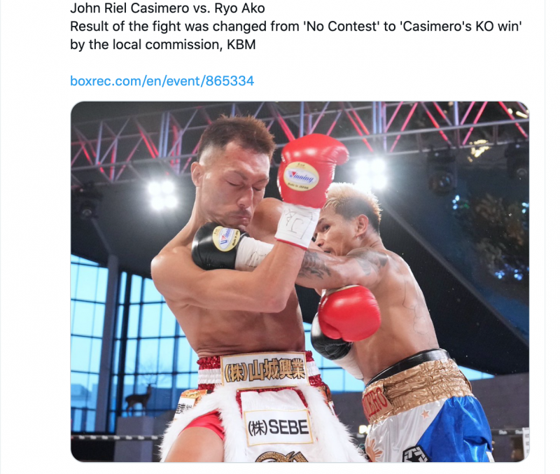 カシメロ のパンチが赤穂のアゴをとらえた瞬間、判定覆りに主催のトレジャーボクシングがこの画像とともに発表