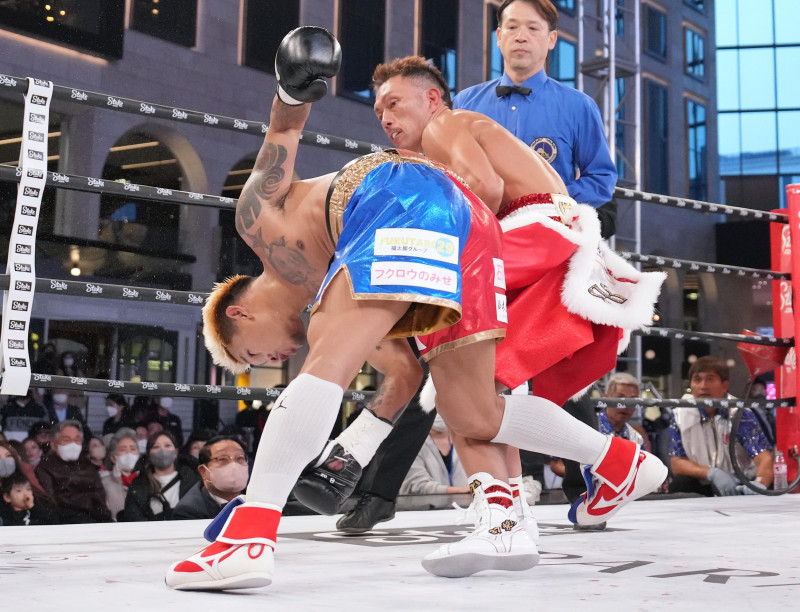 カシメロがバランスを崩し赤穂がそこにパンチ!これがダウンとなる。(Naoki Fukuda)