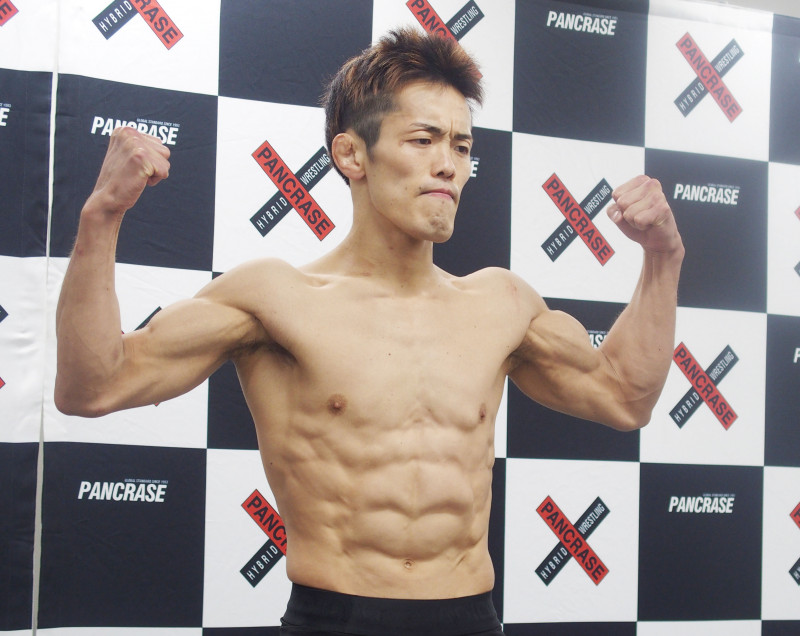 猿飛流はバキバキに割れた腹筋を見せてマッスルポーズ