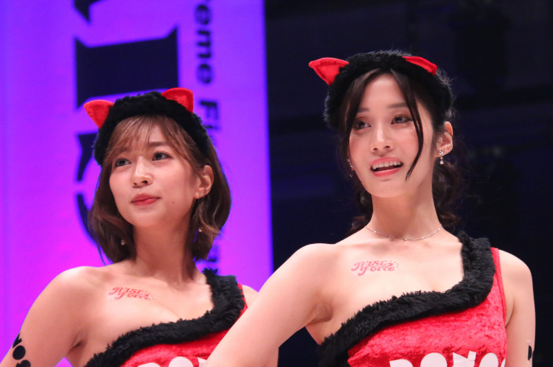 クリスマスはラウンドガール衣装にも注目が集まった。グラドルの大貫彩香(左)と高橋凛