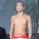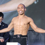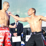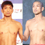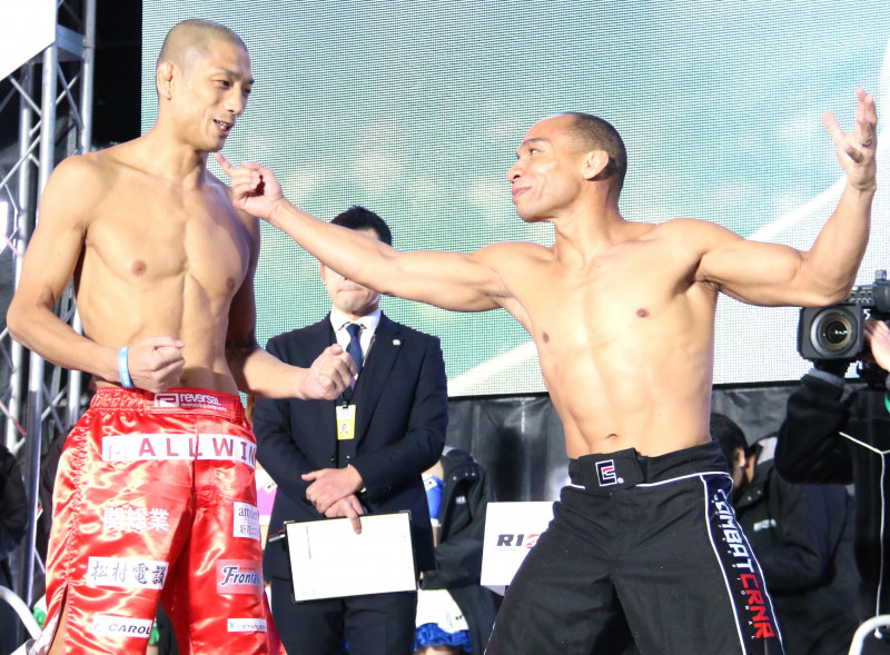 所(左)は坊主頭ガリガリボディで計量パス。ドッドソン(右)は両手を広げるパフォーマンスで会場を盛り上げた