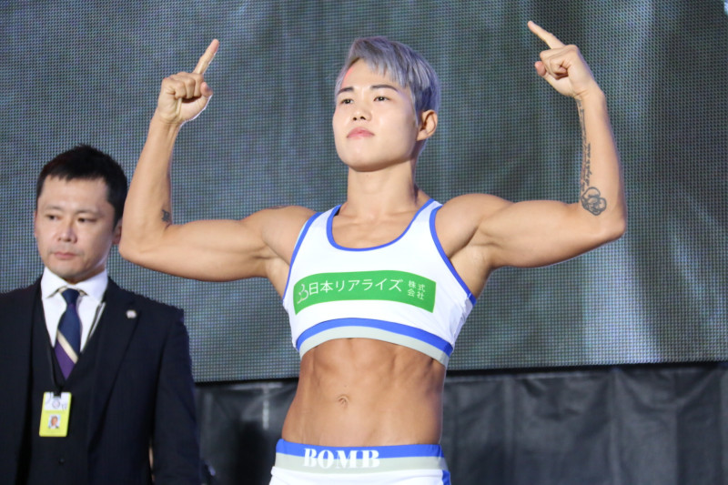 パクが計量パスで両指を突き上げる
