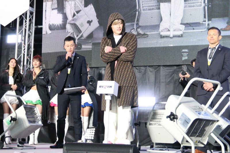 両手で襟を抑えながら計量