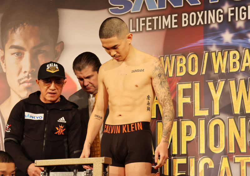 井岡ヒヤリ、最初の計量台では130gオーバー!すぐにパンツを脱いでリミットでパスした。