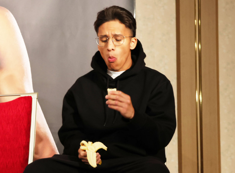 美味しそうにバナナを頬張るフランコ(計量後、井岡の再計量時)