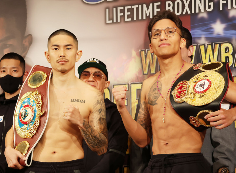 井岡とフランコが計量パスでファイティングポーズを決めた