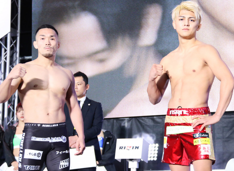 中原由貴(左)と鈴木千裕(右)が計量パス