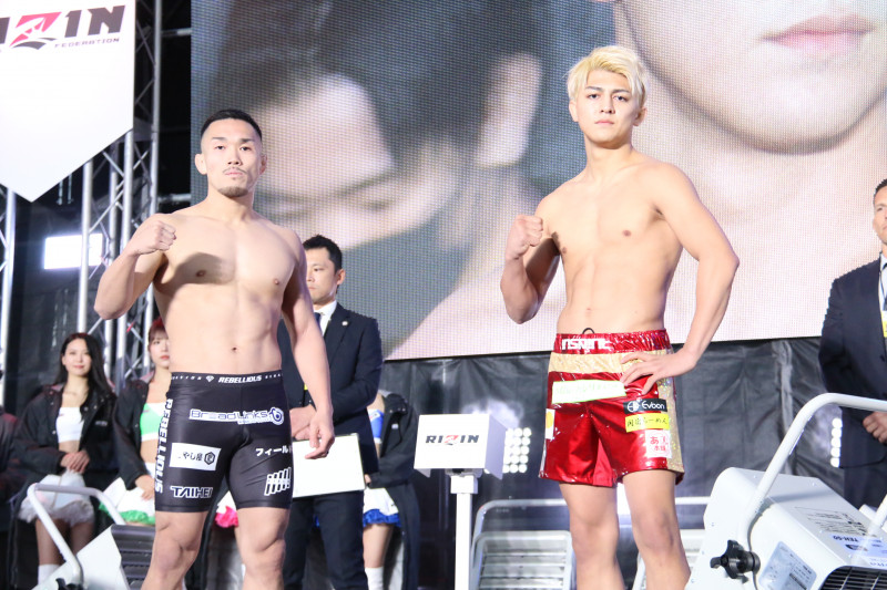 中原由貴(左)と鈴木千裕(右)が計量パス