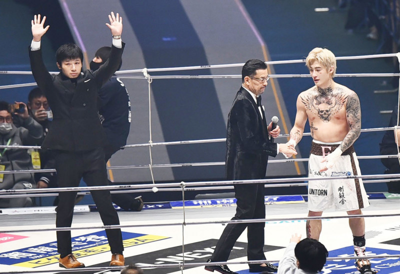 リングに上がって観衆に手を振る斎藤