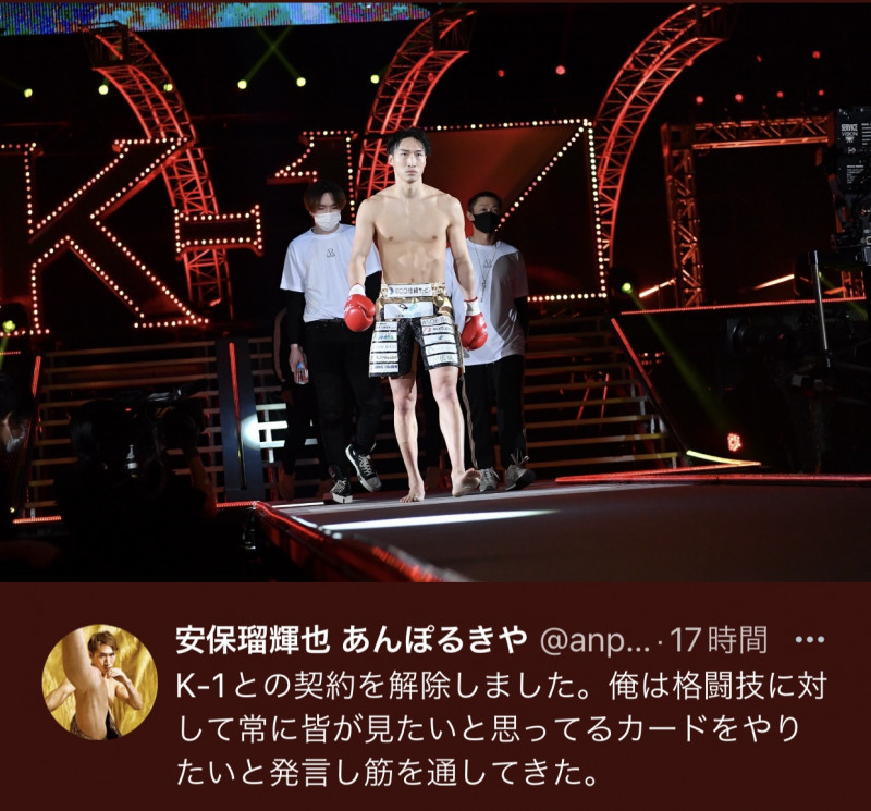 契約解除の報告写真は、安保のK-1ラスト試合である昨年4月のK’FESTA.5~での入場シーン @anpo_rukiya より