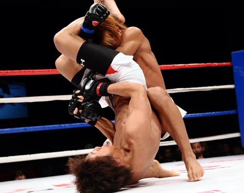 樋口(下)が金太郎から鮮やかに三角絞めを極める=11年