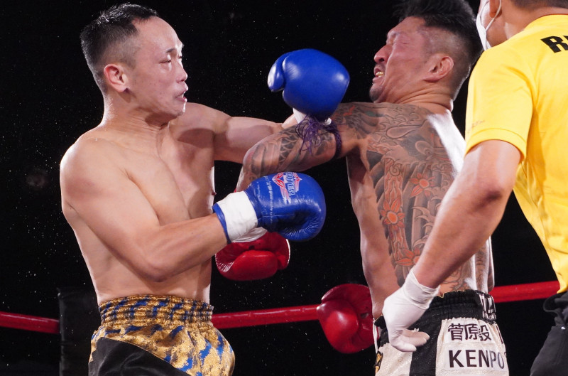 パンチでKO勝利する吉田(左)