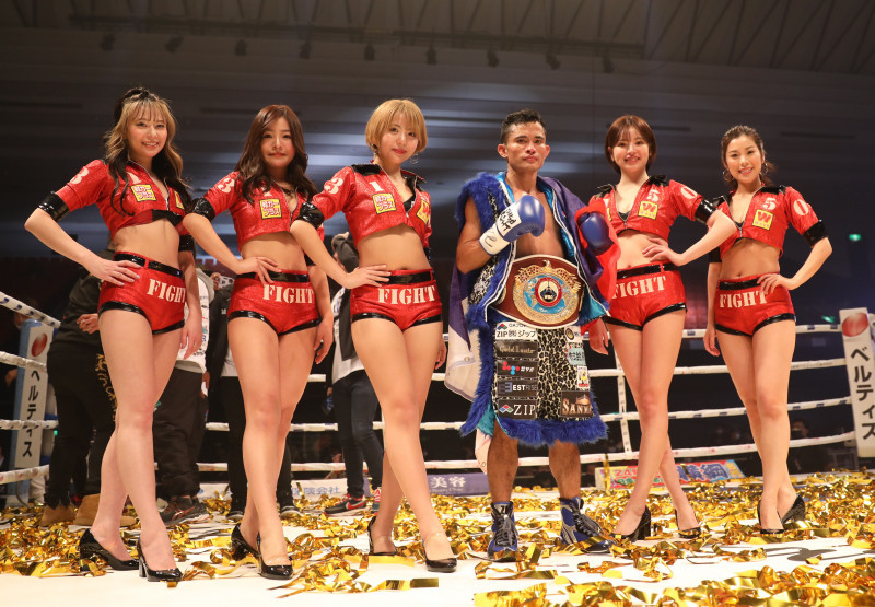 3150FIGHTラウンドガール「3150GIRLS」。左から礒部希帆、西野咲、佐々木萌香、(新王者ジェルサェム)小森ほたる、内田瑞穂©︎3150FIGHT