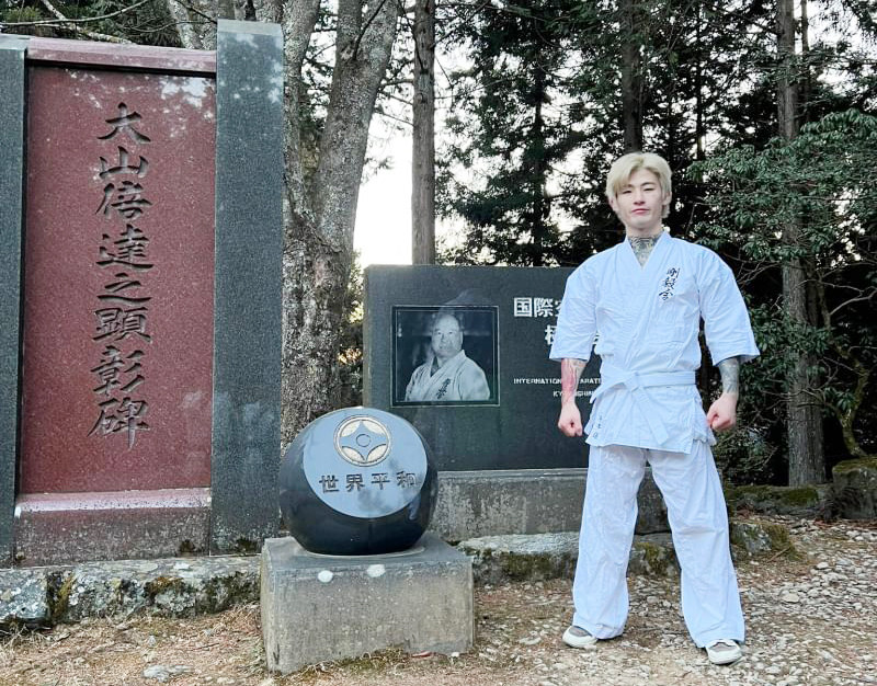 大山倍達総裁の碑の前で