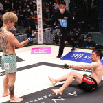 グラップラーの弥益(左)に腰を落として打撃をヒットさせる平本