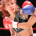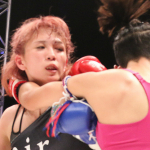 朝久(右)に強烈なローキックで効かせる与座(左/昨年2月)