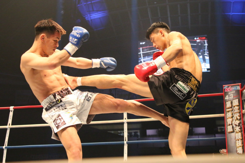 前回の対戦で与座(左)はローキックを決めて朝久(右)を攻略した