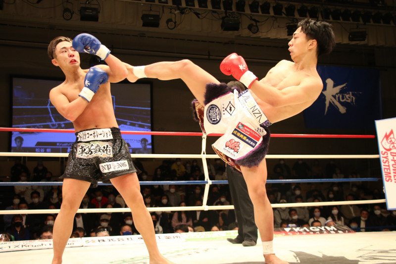 多彩な蹴りで完封勝利の松谷(右)=昨年12月