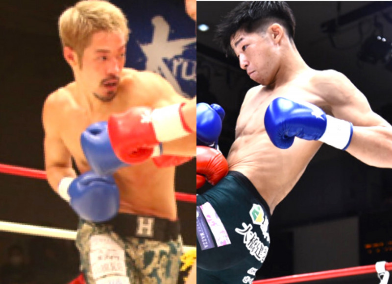 Krushスーパー・ライト級王座決定トーナメント一回戦で東本(左)と稲垣(右)が対戦