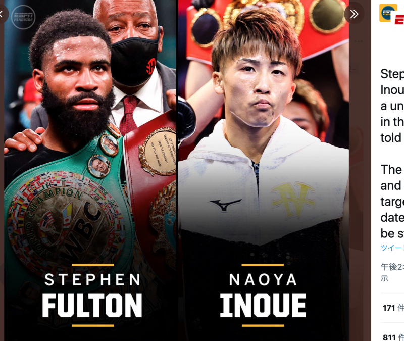 井上とフルトンの合意を報道した対戦ビジュアル。写真にはESPNのロゴまで入る。(ESPN RINGSIDE Twitterより)