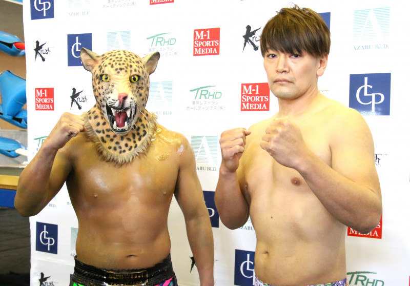 アニマルマスクをかぶってポーズを決めるANIMAL(左)と対戦する中平(右)