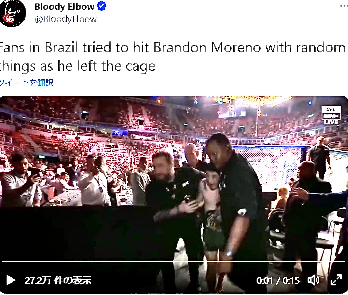 警備員たちに抱えられ逃げるモレノ @BloodyElbow