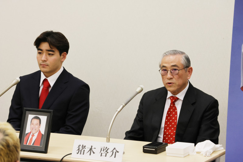 会見でコメントする、猪木さんの実弟・啓介氏(右)、左は孫の寛太氏