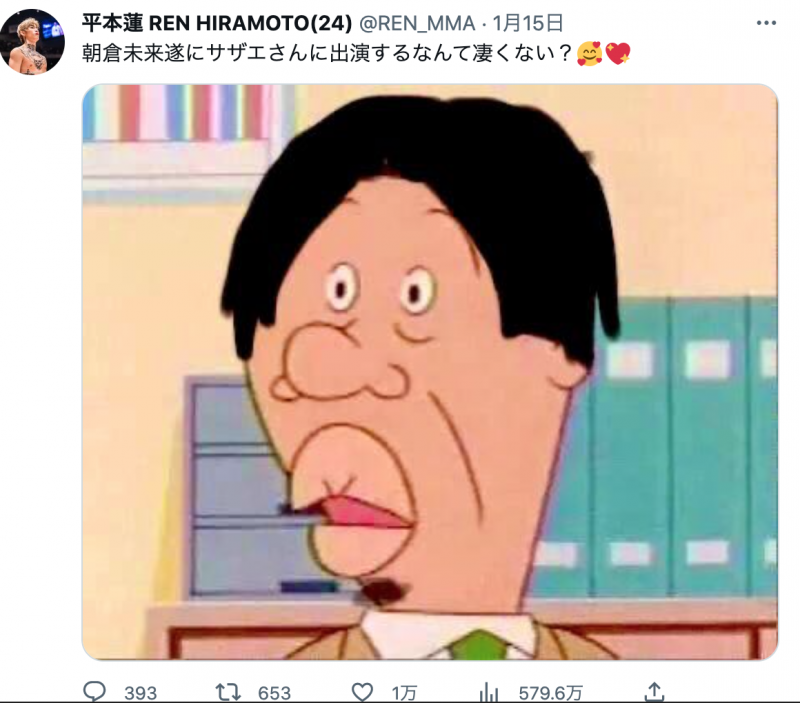 これが大バズリ!このアナゴさんに髪型を書き朝倉未来だと15日にアップした。これが原因か(平本蓮Twitterより)