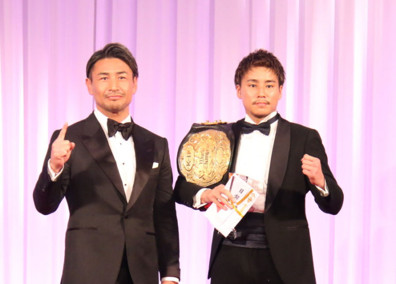 軍司泰斗(右)が22年度MVPに輝き、魔裟斗(左)も祝福した