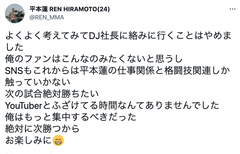 平本が無駄な絡みしない宣言(平本のTwitterより)