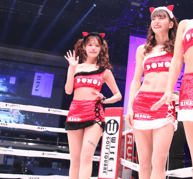 編集部撮影の広瀬晏夕のラウンドガール姿(左)