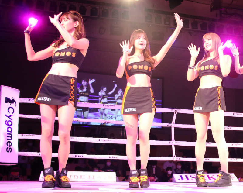 編集部撮影の広瀬晏夕(中央)のラウンドガール姿