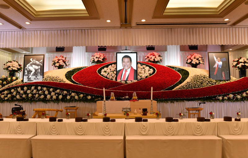 猪木さんの通夜式、祭壇は真っ赤な闘魂タオルをイメージし装飾された ©IGF