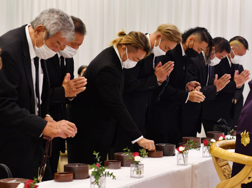 猪木さんの通夜式に参列した、左から坂口征二、藤波辰爾、棚橋弘至、オカダ・カズチカ、中邑真輔、永田裕志、天山広吉 ©IGF