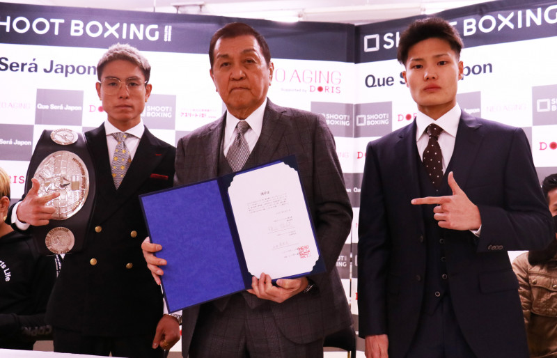 23年SB開幕メインでタイトル戦を行う王者・植山(左)、挑戦者・山田(右)。調印書を手にするシーザー会長(中央)