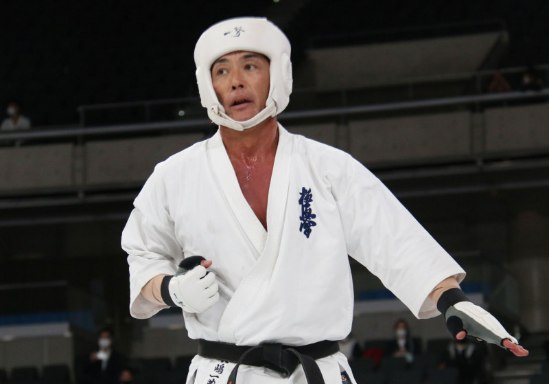 最終延長戦で前蹴りで技有りとなり、残心ポーズを決める長嶋(準決勝)