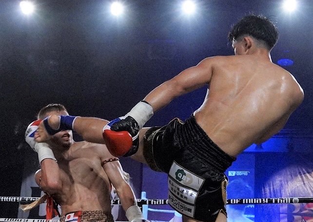 このハイキックでダウンを奪う大翔(右)、勝利し第5代WMC日本フェザー級王者に