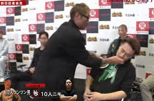 3.おでんツンツン男(左)が10人ニキに寿司を押し付ける(朝倉未来YouTubeより)