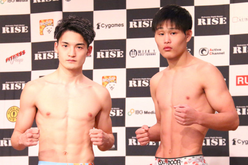 昼大会のメインで対戦する大﨑(左)と寺山(右)は計量でバキバキボディを見せた