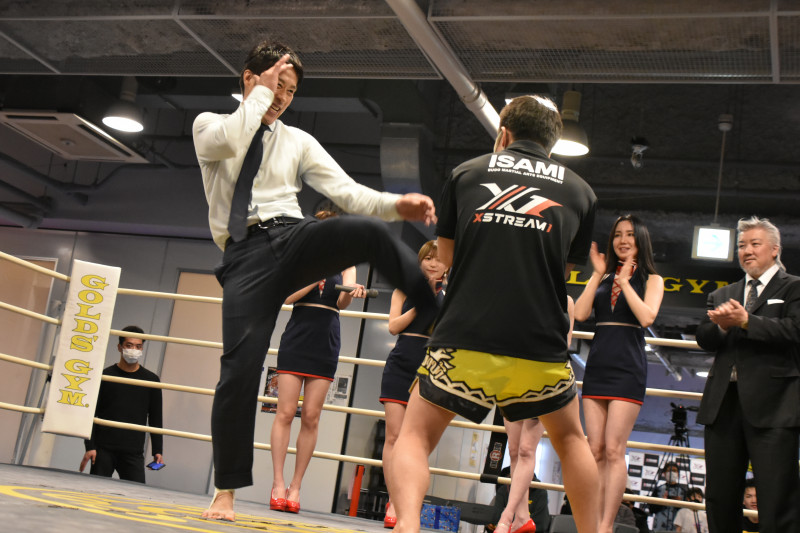 「1分間ミドルキック連打チャレンジ」に参戦した前田プロデューサー